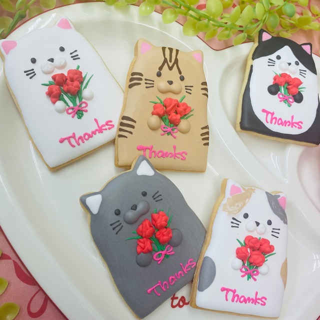 画像はカーネーションですが、 カラフルなお花を持たせます。 おまかせでにゃんこにちなんだ焼き菓子とセットにしてラッピングいたします。 その時の作成で内容は変わります。 ちょっとしたプレゼントにいかがでしょうか? 画像にないにゃんこをご希望の方は、メッセージからにゃんこの画像をお送りください^ᴗ ̫ ᴗ^♡ 【原材料】 北海道産小麦粉、北海道産バター、グラニュー糖、卵、バニラオイル 、メレンゲパウダー、粉糖、竹炭パウダー、コーンシロップ、着色料(赤3号40号・黄4号5号・青1号2号)(一部に小麦・卵・乳を含む) 【賞味期限】 制作日から3週間※お早めにお召し上がりください。