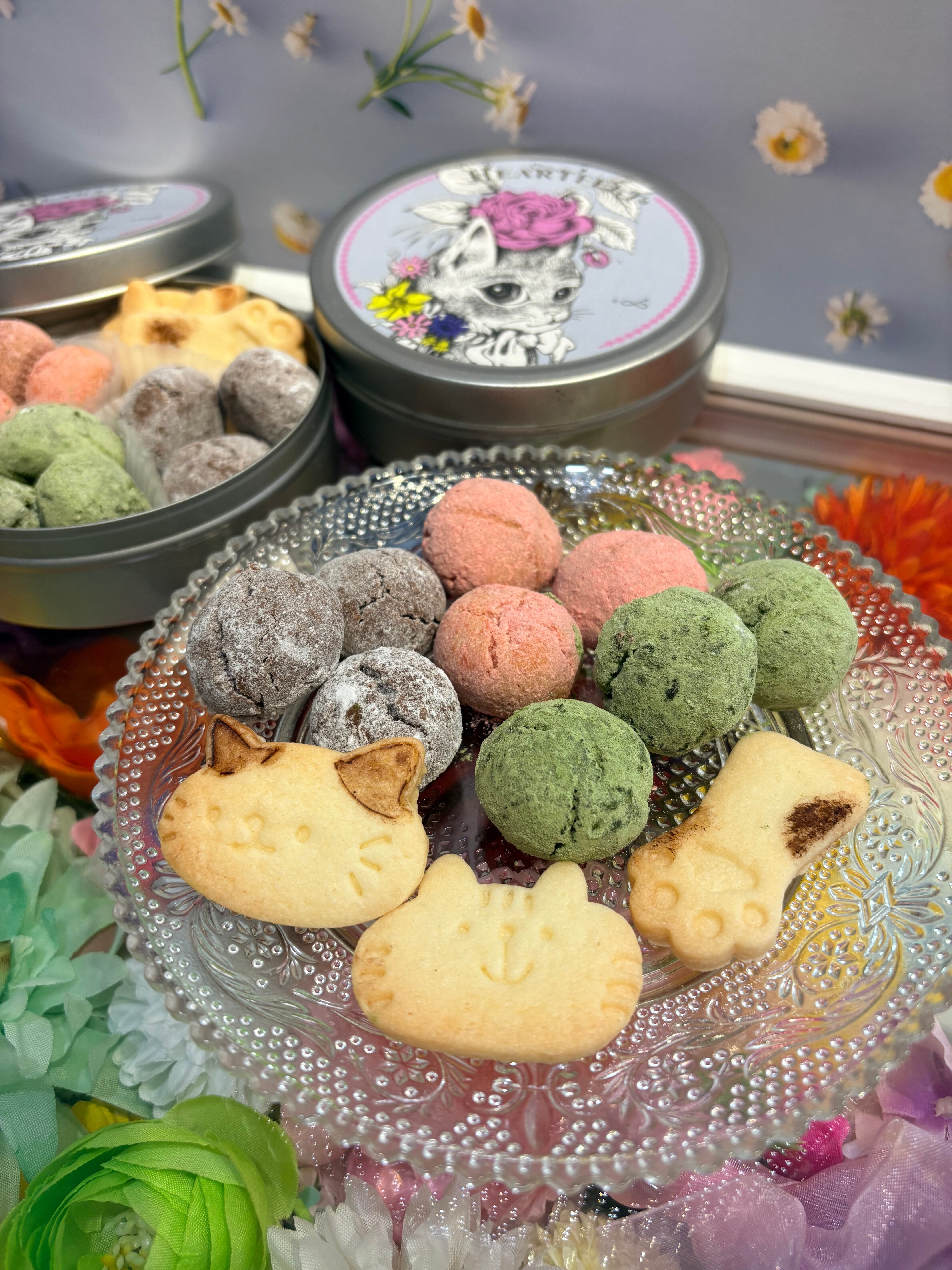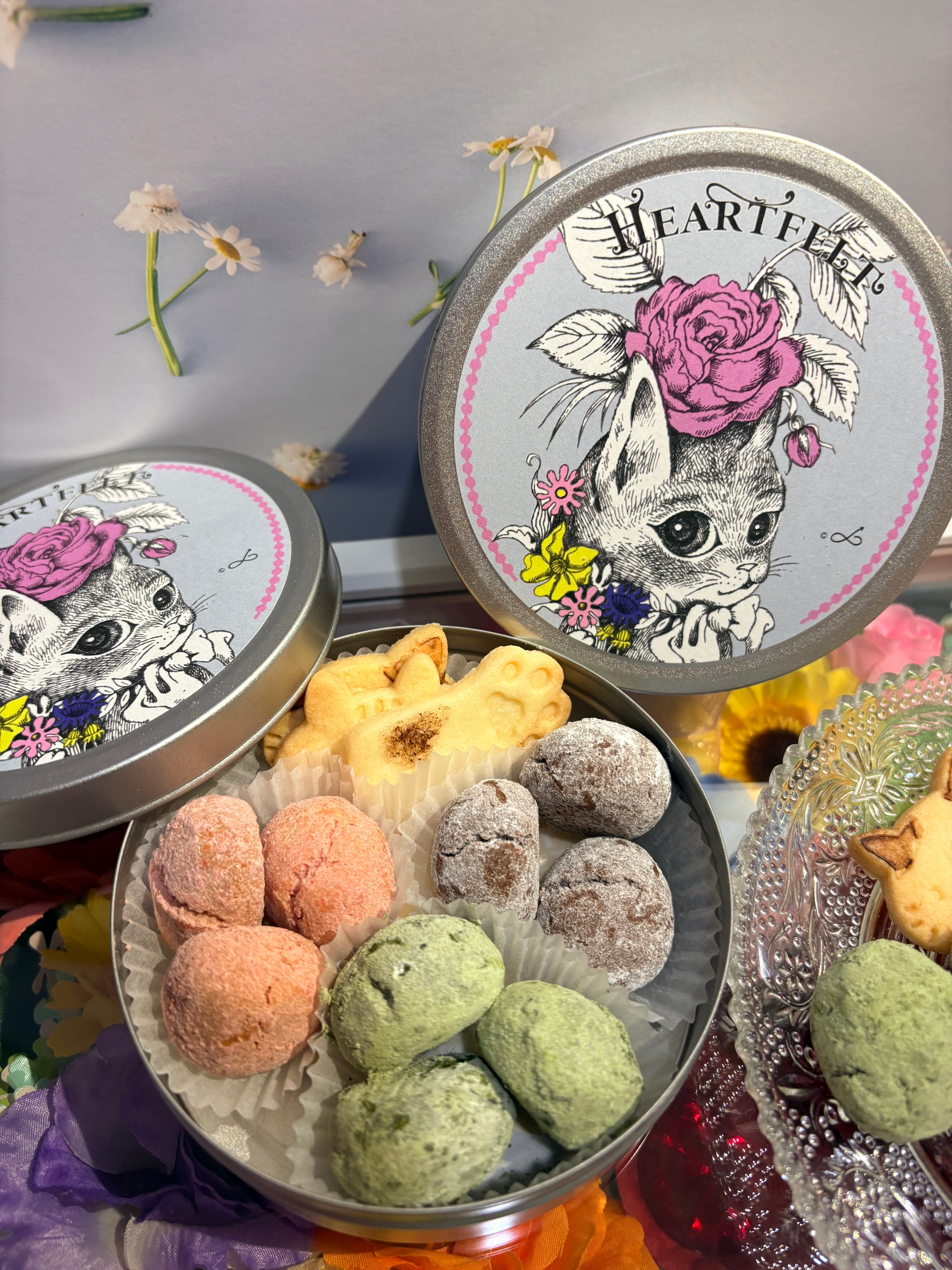 かわいらしい10cmの缶に、サクホロのスノーボールクッキーと猫の型抜きクッキーが詰まっています。