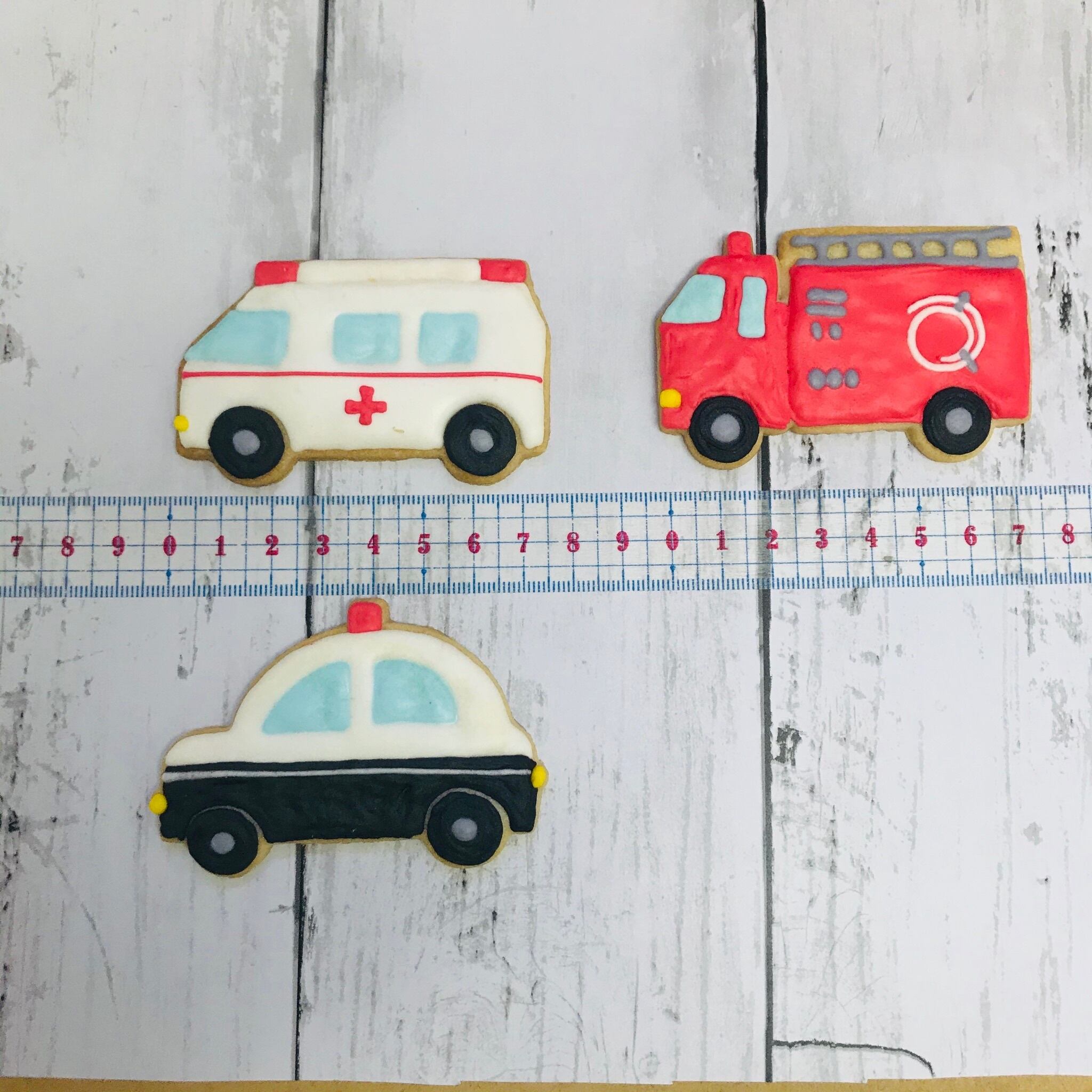 救急車、パトカー、消防車の3台と